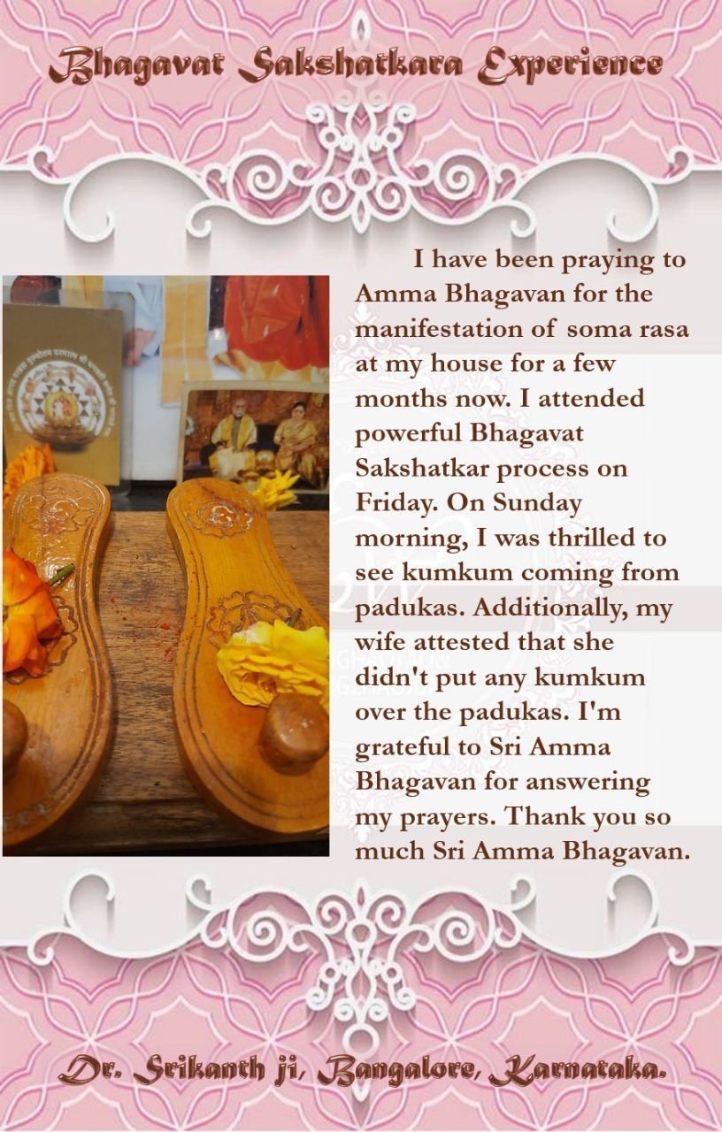 私は、数ヶ月前から、我が家にソーマラサ(ソーマジュース)が現れるようにアンマバガヴァンに祈っていました。金曜日にパワフルなバガヴァット・サクシャッカーラプロセスに参加しました。日曜日の朝、私はパドカからクムクムが出るのを見て感激しました。さらに、妻がパドカにクムクムをかけていないことを証言してくれました。私の祈りに答えてくれた、シュリ・アンマバガヴァンに感謝いたします。シュリ・アンマバガヴァン、本当にありがとうございます。