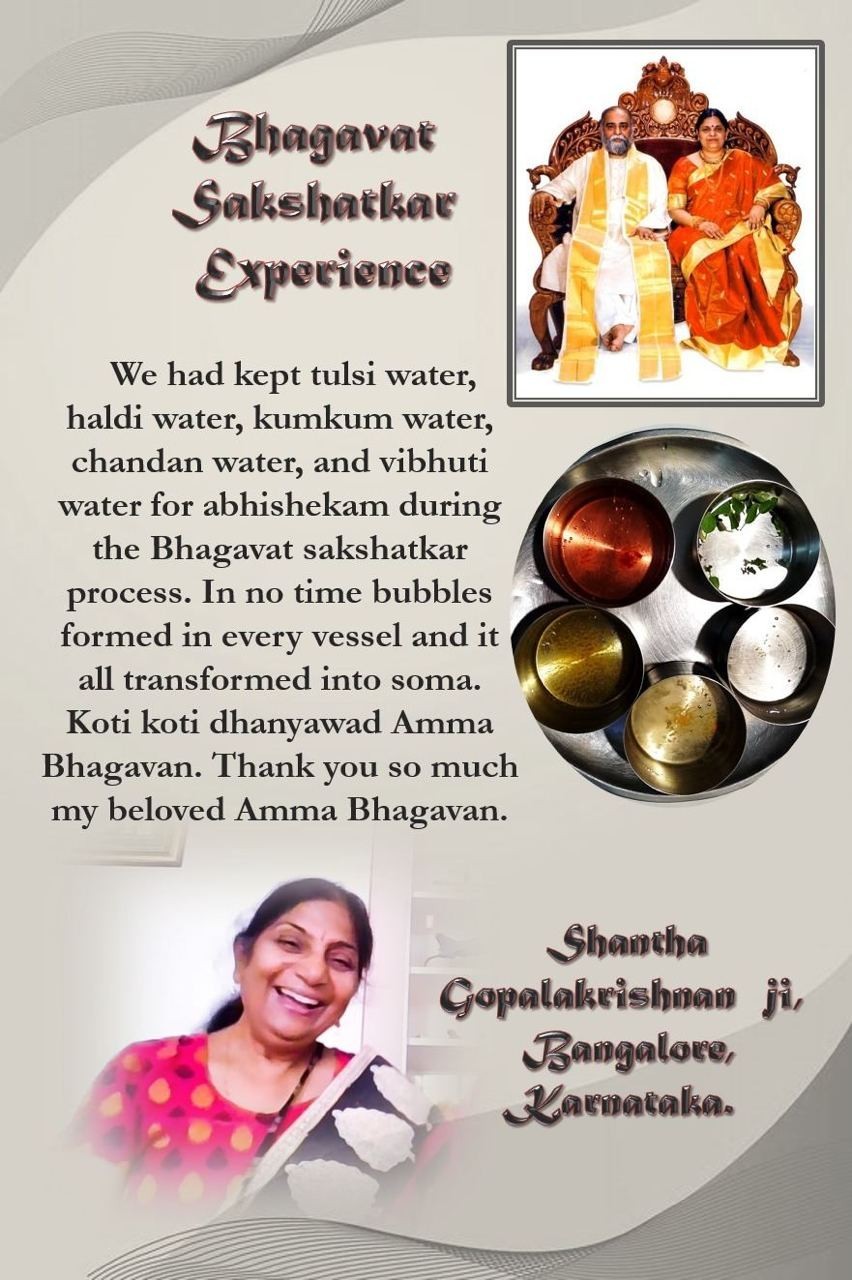 私たちはバガヴァット・サクシャッカーラのプロセスの間、トゥルシーの葉を入れた水、ハルディ(ウコン)入りの水、クムクム入りの水、チャンダン(白檀)入りの水、ヴィブーティ(聖なる灰)のはいった水をアビシェーカムのために用意して置いていました。