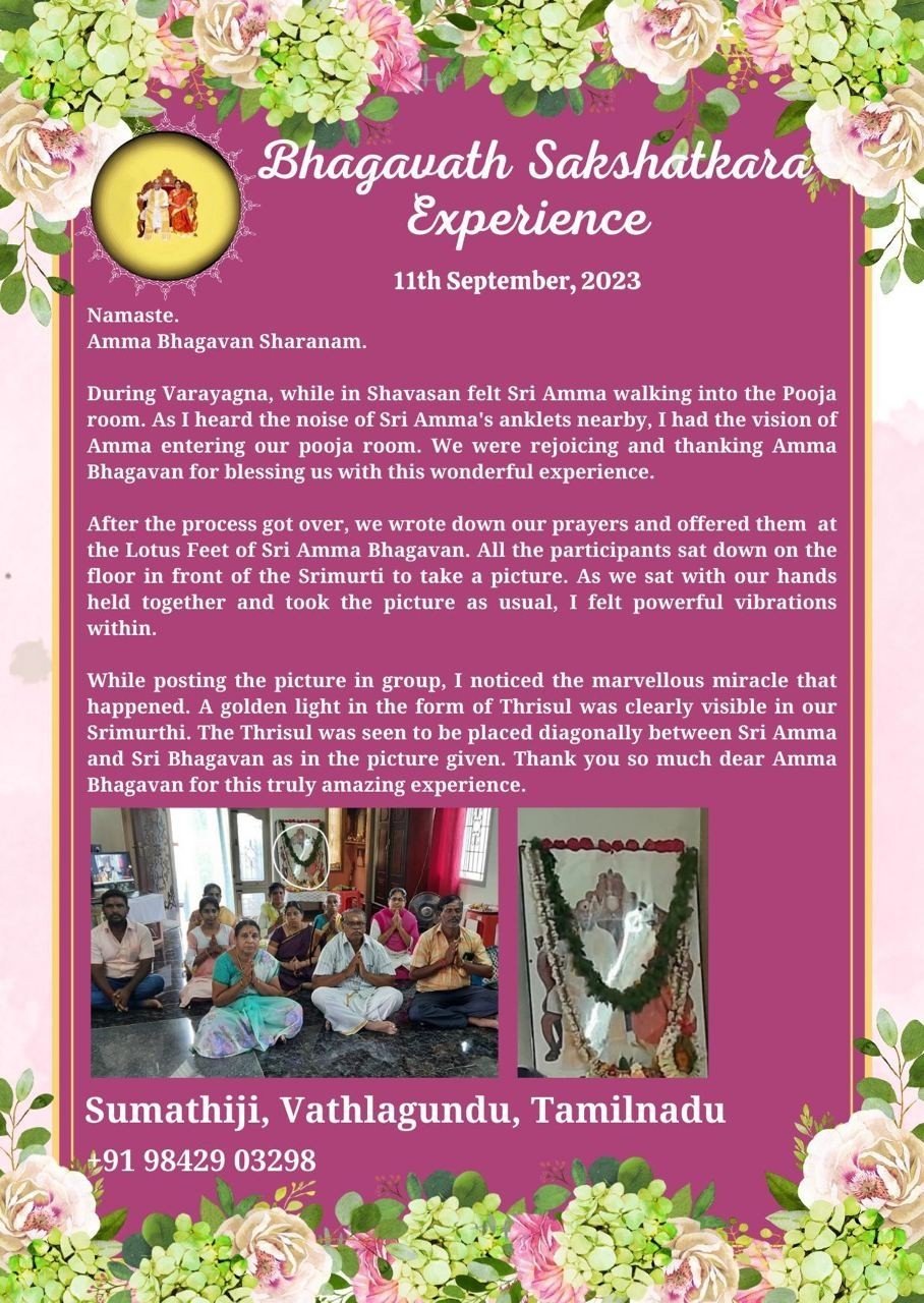 ヴァラヤグニャの間、シャヴァアサナに入っている時、シュリ・アンマがプージャ・ルームに歩いて来られるのを感じました。すぐ近くにシュリ・アンマのアンクレットの音が聞こえてきて、アンマが私たちのプージャ・ルームに入って来られるビジョンを見ました。私たちは喜び、この素晴らしい体験を祝福し与えて下さった、アンマバガヴァンに感謝していました。