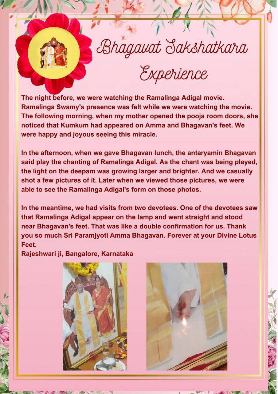 前日の夜、私たちはラーマリンガ・アディガルの映画を見ていました。映画を見ている間、ラーマリンガ・スワーミーのプレゼンスが感じられました。翌朝、母がプージャ・ルームのドアを開けると、クムクムがアンマとバガヴァンの足の上に現れているのに気づきました。私たちはこの奇跡を目の当たりにして、幸せで喜びに包まれました。