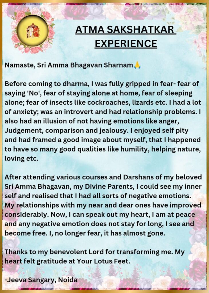 様々なコースに参加し、敬愛するシュリ・アンマ・バガヴァン、神聖な両親のダルシャンを受けさせていただくうちに、自分の内面を見ることができ、自分があらゆる種類のネガティブな感情を持っていることに気づくようになりました。