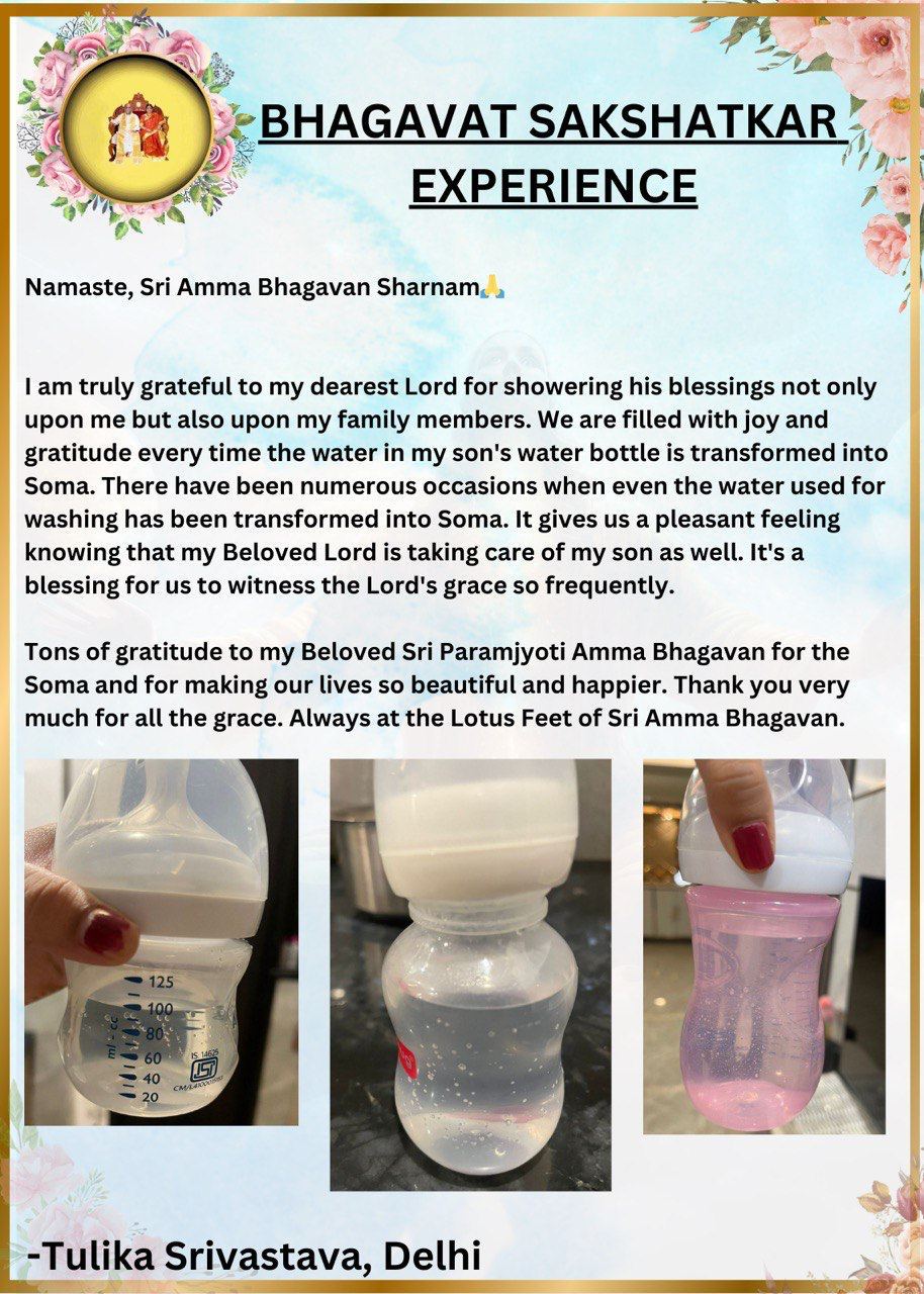 私だけでなく 私の家族にも祝福を降り注いでくださいましたことを 親愛なる主に心から感謝しております。私たちは、息子のウォーターボトルの水がソーマに変わるたびに、喜びと感謝の気持ちでいっぱいになります。洗濯に使われた水でさえも、ソーマに変わったことが何度もありました。