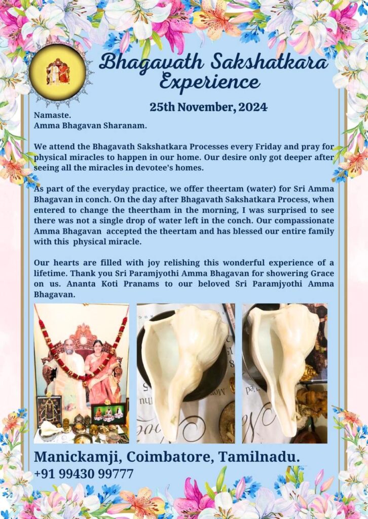 毎日の実践の一環として、私たちはホラ貝に入れたティルサム(聖水)をシュリ アンマ バガヴァンのためにお捧げしております。バガヴァット サクシャッカーラ プロセスの翌日、朝ティルサムを交換しようと入ったとき、ホラ貝の中に一滴の水も残っていないのを見てびっくりいたしました。私たちの慈悲深いアンマ バガヴァンはティルサムを受け入れ、私たち家族全員をこの物理的な奇跡で祝福してくださったのです。