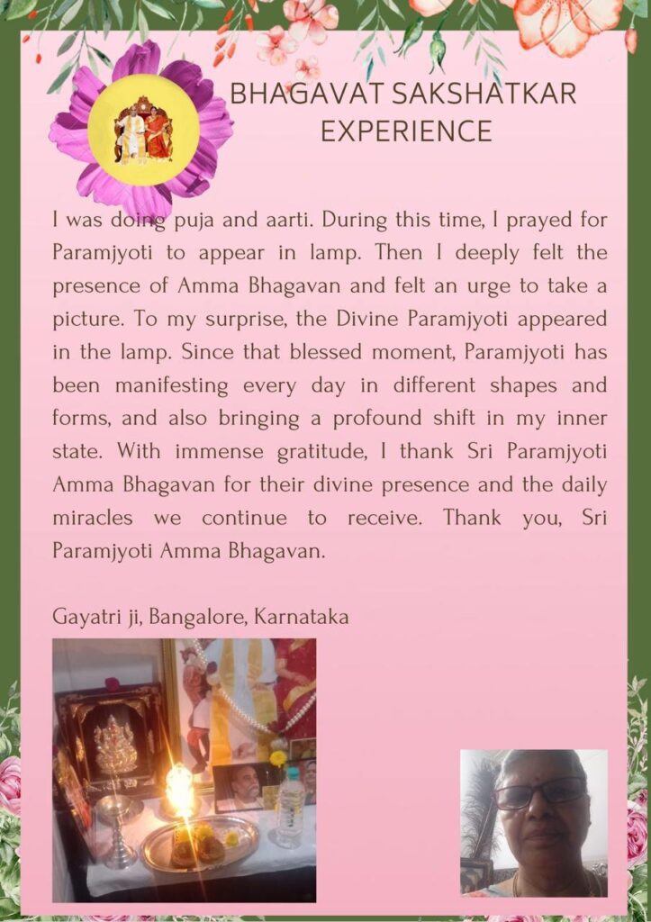 私はプージャとアルティを行っていました。この間に、私はパラムジョッティがランプの中に現れてくださるよう願って祈りを捧げました。その後 アンマ バガヴァンのプレゼンス(存在)を深く感じ、写真を撮りたいという衝動に駆られました。