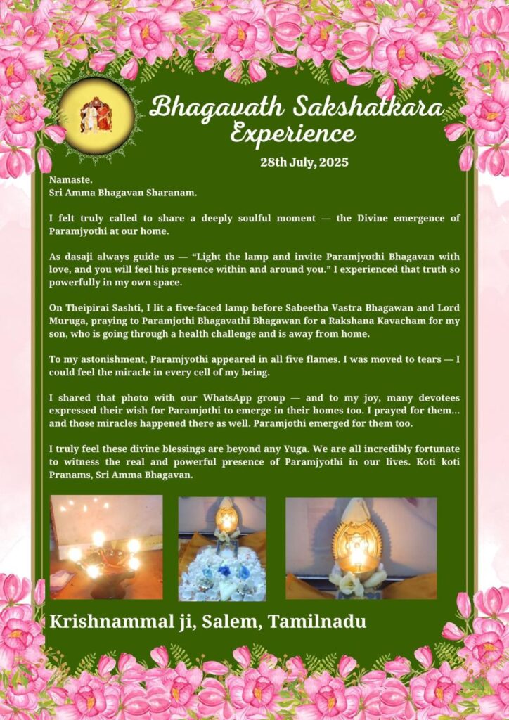 私はその写真を私たちのWhatsApp(ワッツアップ)グループにシェアいたしました。-すると、嬉しいことに、多くの信奉者たちが、自分たちの家でもパラムジョッティが顕れることを願っていると表明してくれました。私は彼らのためにも祈りを捧げました。…すると、彼らの家でも同じように そうした奇跡が起こりました。パラムジョッティが彼らにも顕れたのです。