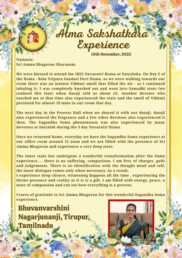 帰宅後は毎日、正午頃に私たちの事務所でスガンダ・ソーマを体験いたしますが、シュリ・アンマ・バガヴァンの臨在に満たされ、非常に深い状態を体験しております。