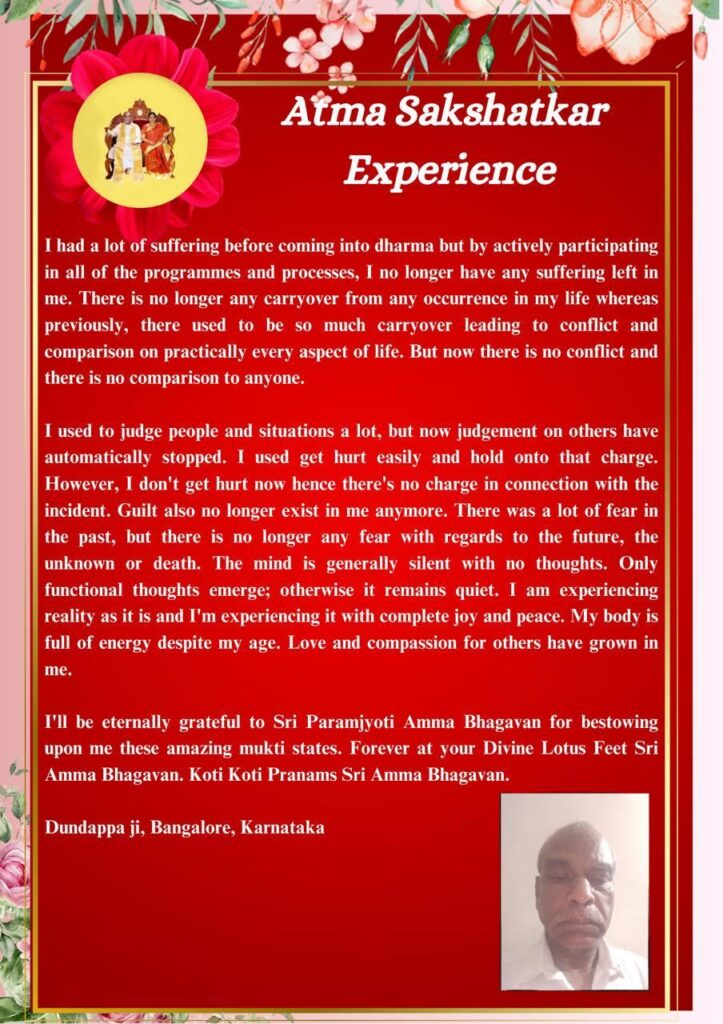 このような素晴らしいムクティ(悟り)の状態を授けてくださったシュリ・パラムジョッティ・アンマ・バガヴァンに、永遠に感謝し続けるでしょう。