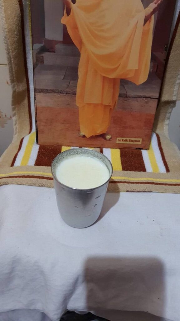 その日、プロセスが終わってプージャ部屋のドアを閉めるとき、主がミルクを求めていらっしゃるように感じました。私はミルクを捧げました。びっくり嬉しかったことに、1時間後にその部屋に入ると、コップの中のミルクが減っていました。この素晴らしい光景を見て、計り知れないほどの喜びを感じました。