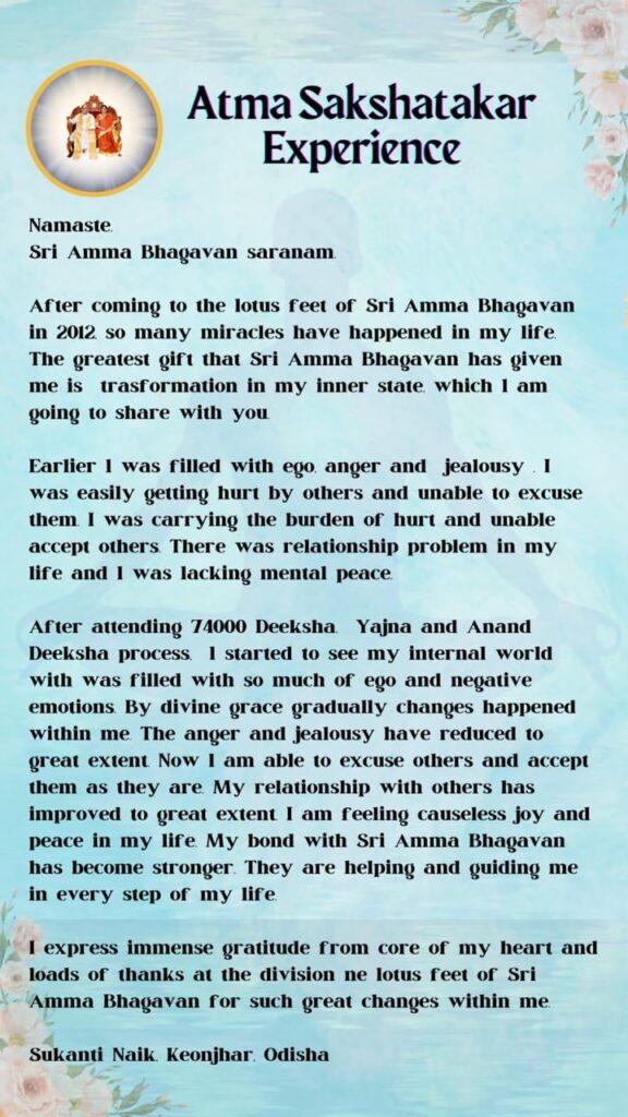 私の中にこのような大きな変化をもたらしてくださったシュリ・アンマ・バガヴァンの神聖な蓮華の御み足に、心の底から計り知れない感謝を捧げます。