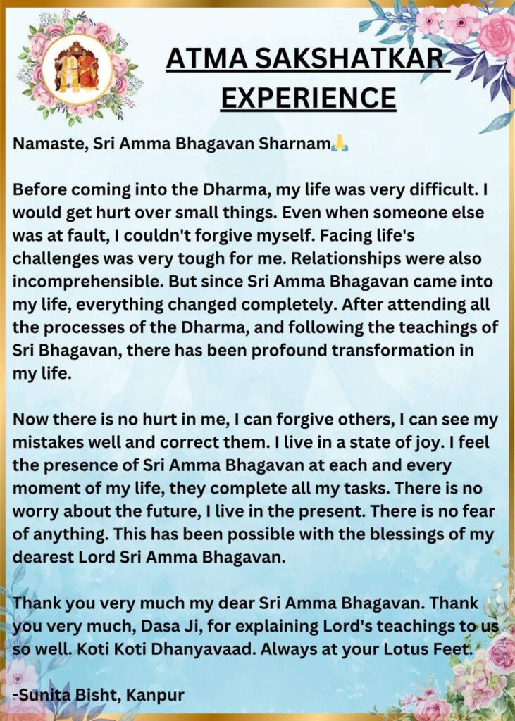 ダルマのすべてのプロセスに参加し、シュリ・バガヴァンの教えに従うようになってから、人生に深い変容が起こりました。