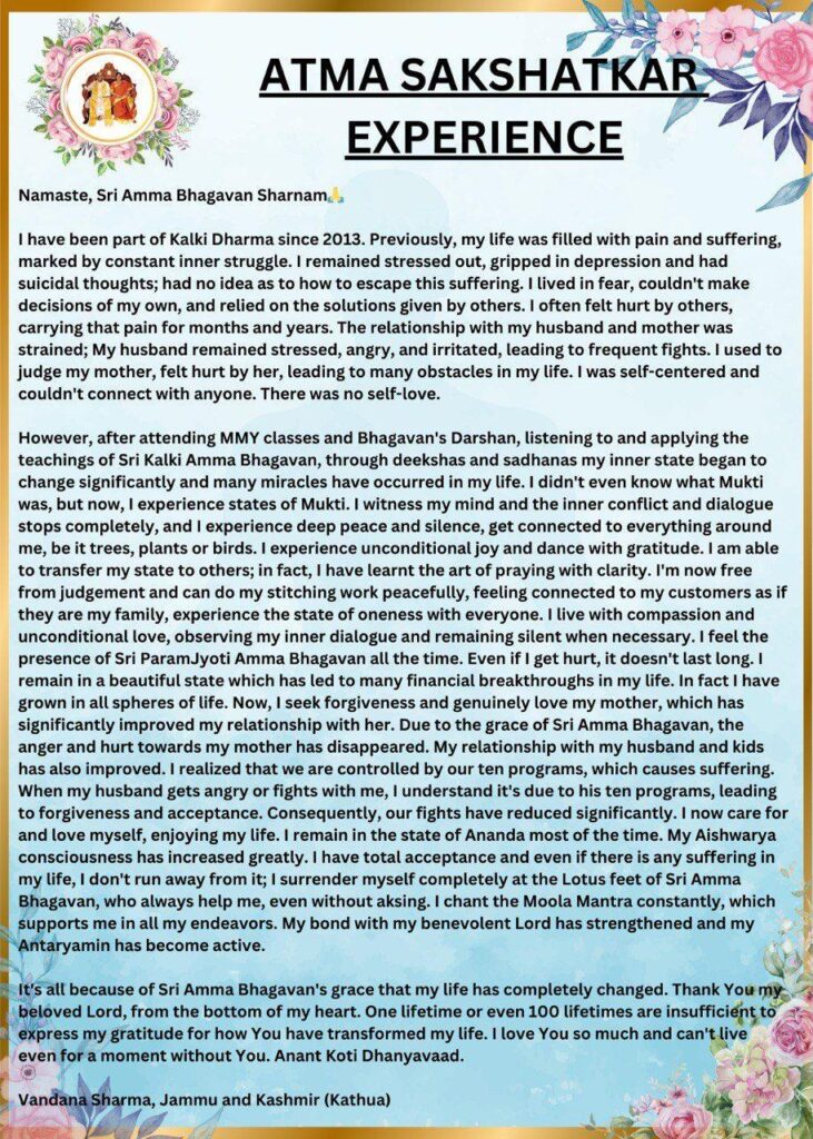 けれども、ムクティ・モクシャ・ヤグニャ・クラスとバガヴァンのダルシャンに参加させていただき、シュリ・カルキ・アンマ・バガヴァンの教えを聞かせていただき、実践し、ディクシャとサダナを通して、私の内側の状態は大きく変わり始め、人生に多くの奇跡が起こりました。
