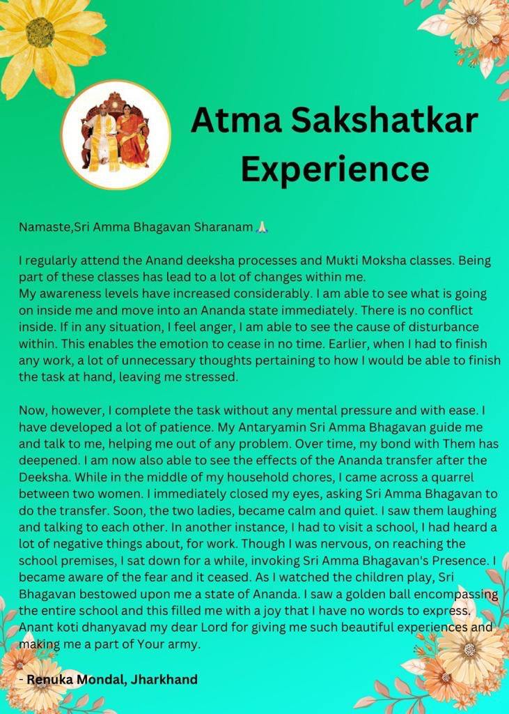 アンタリャーミン・シュリ・アンマ・バガヴァンは、私を導き、私に語りかけ、どんな問題でも解決できるようにと、助けてくださいます。