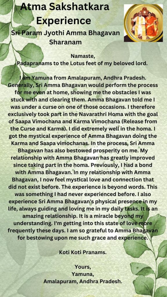 ホーマはもの凄くうまくいきました。私は アンマ バガヴァンがカルマヴィモーチャナとサーパ ヴィモーチャナをしてくださっている神秘的な体験をさせていただくことができたのです。そのプロセスの中で、シュリ アンマ バガヴァンは 私に繁栄も授けてくださいました。