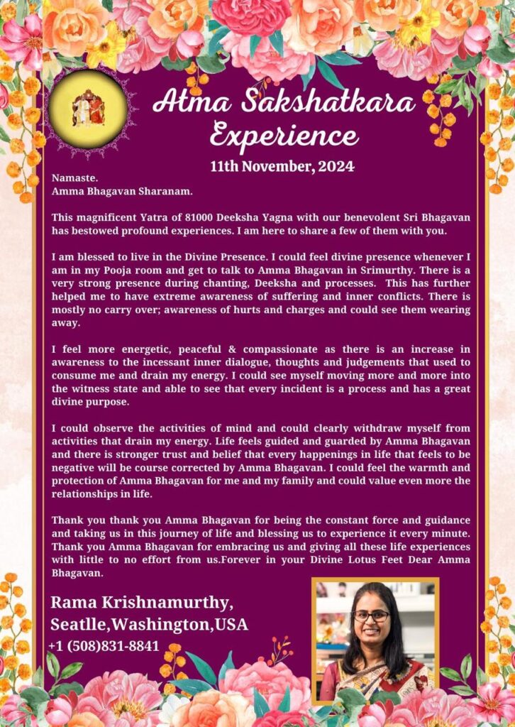 私たちの慈悲深いシュリ・バガヴァンとの、81000ディクシャ・ヤグニャというこの壮大なヤトラ(旅)は、私たちに数々の深遠な体験を授けて下さっています。私はそのうちのいくつかを皆さんと分かち合うためにここにいます。