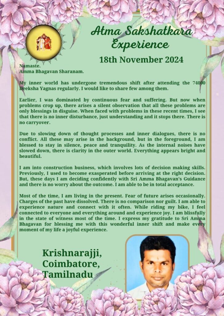 以前は、正しい決定をする前は苛立っていました。しかし、最近はシュリ・アンマバガヴァンのお導きにより自信を持って決定することができ、結果を心配することはありません。私は完全に受け入れることができます。ほとんどの時間、私は今に生きています。未来への不安は時折生じます。過去のチャージは溶けて無くなりました。比較も罪悪感もありません。私はしばしば自然と繋がり、体験することができます。バイクを運転している時は、周りのみんなや全てとつながっていると感じ、喜びを体験します。私はほとんどの時間を目撃者のステイトで、幸せです。