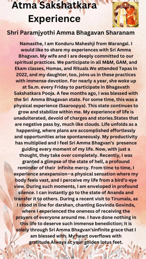 数ヶ月前、私はシュリ・アンマ・バガヴァンのステートをお授けいただきました。しばらくの間、この物理的な体験(サーローピア・神のローカ(次元)への到達した状態)でした。