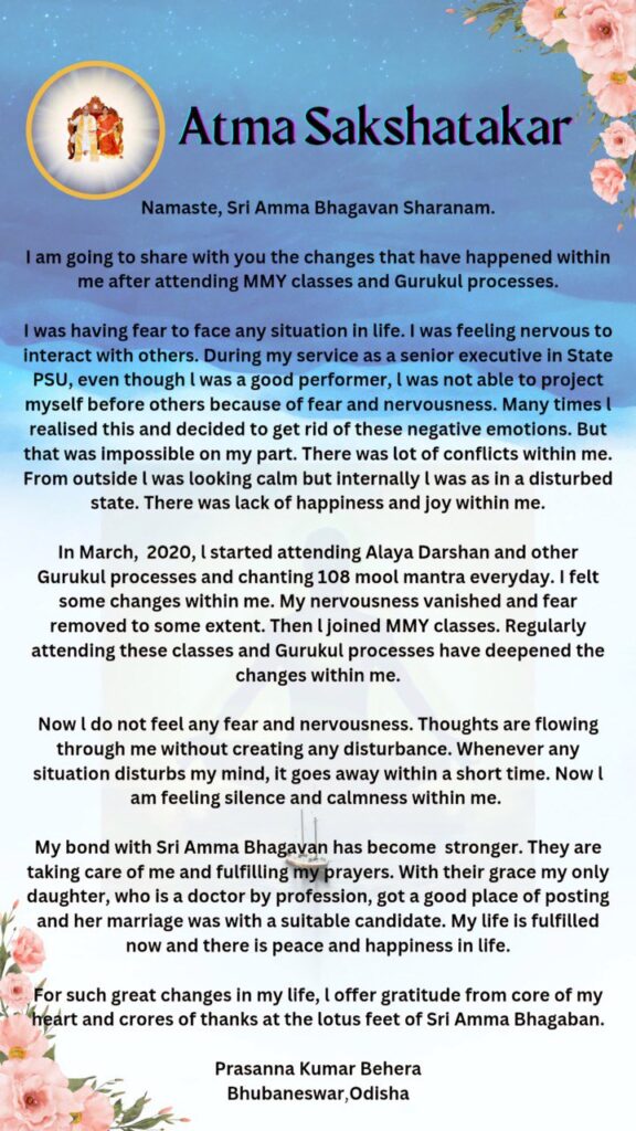 私の人生にそのような素晴らしい変化をくださったシュリ・アンマバガヴァンの蓮花のおみ足元に、心の底より果てしない感謝を捧げます。