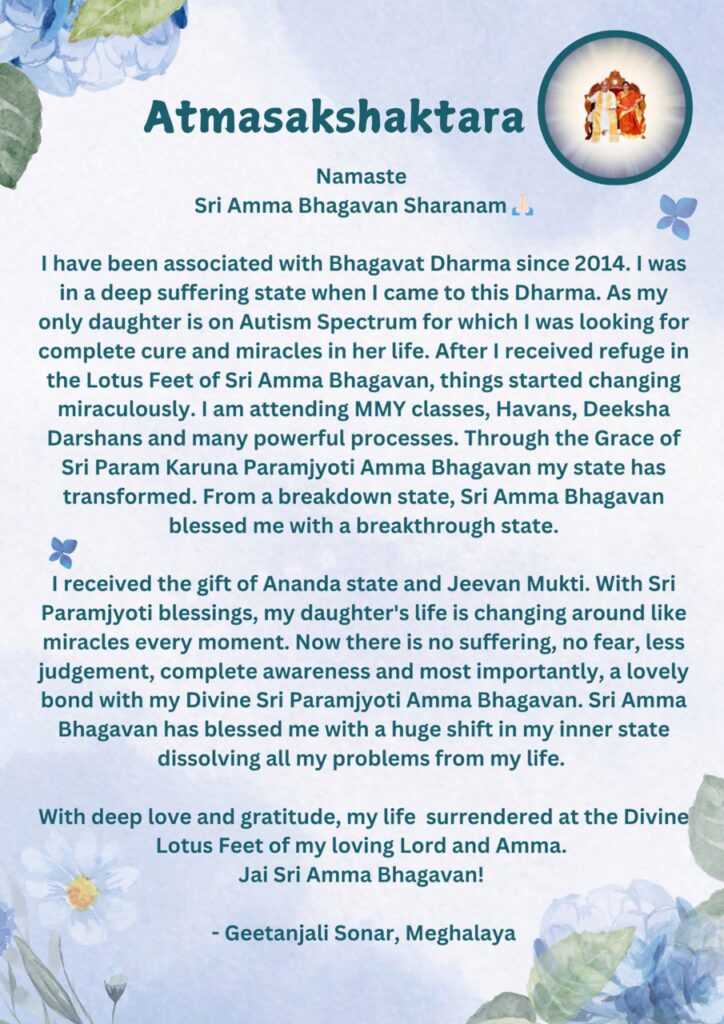 今では、苦しみはなく、恐れもなく、ジャッジも少なくなり、完全な気づきがあり、最も重要なことは、神聖なシュリ・パラムジョッティ・アンマ・バガヴァンとの愛しい絆をいただいていることです。