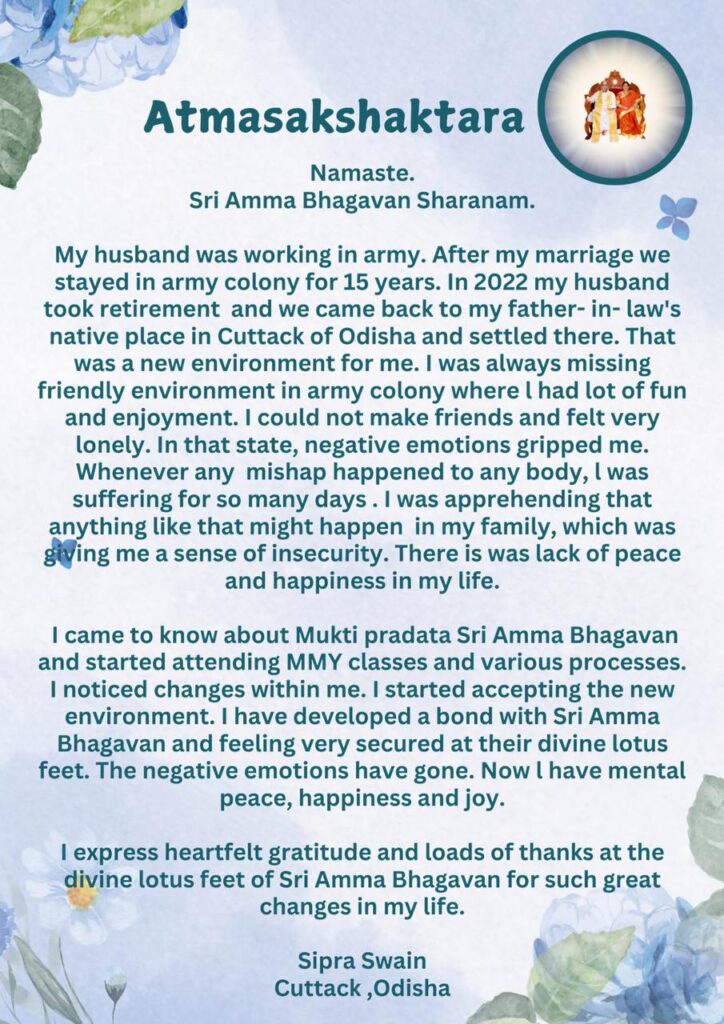 私はムクティ・プラダータ(悟りを与える者)シュリ・アンマバガヴァンのことを知り、MMYクラスや様々なプロセスに参加し始めました。私は自分の中の変化に気づきました。私は新しい環境を受け入れ始めました。シュリ・アンマバガヴァンとの絆が深まり、彼らのディヴァインの蓮華のみ足の元で、とても安心感を感じるようになりました。ネガティブな感情はなくなってしまいました。私は今、精神的な平安、幸福、喜びを手にしています。