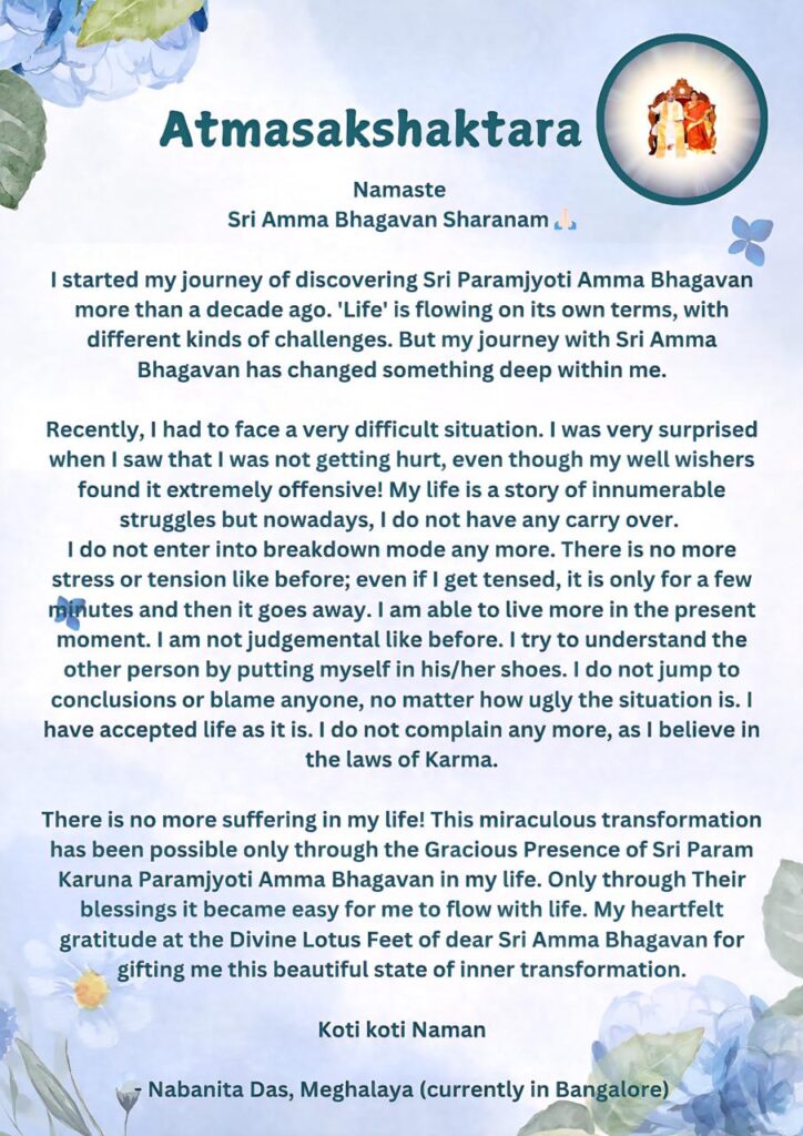 この奇跡的な変容は、私の人生にシュリ・パラム・カルナ・パラッムジョッティ・アンマ・バガヴァンの慈悲深いご臨在があったからこそ、可能となりました。