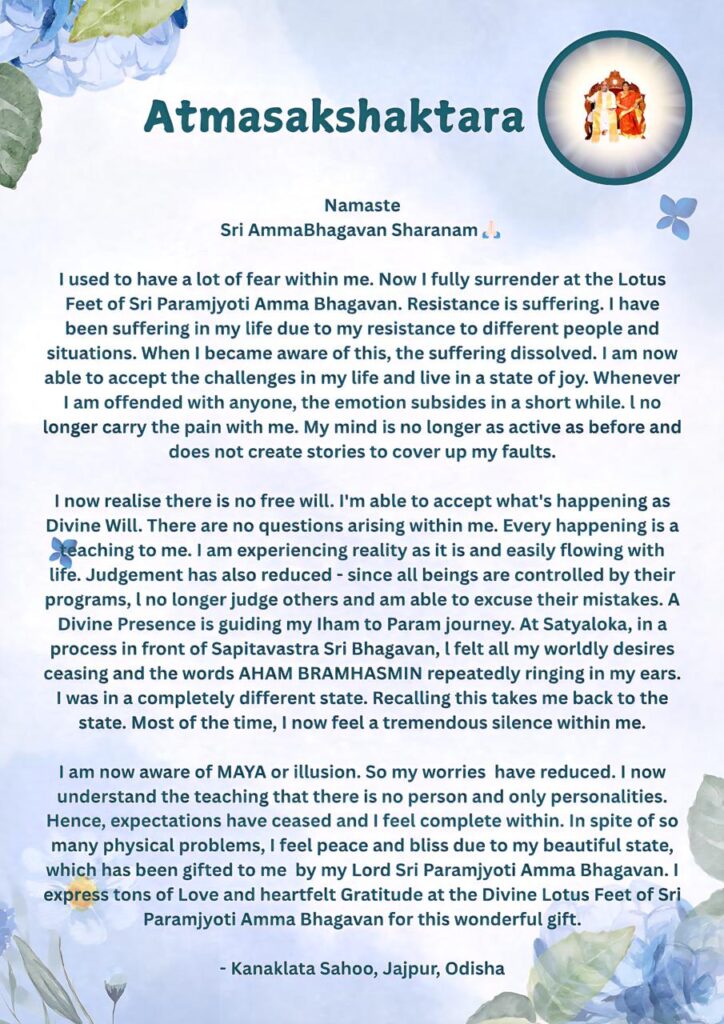 サティアローカにてサピタヴァストラ(黄色い衣)を纏ったシュリ・バガヴァンの前で行われたプロセスで私の全ての世俗的な欲望が消え、「アハム・ブラフマスミン」(私は、プラフマンである)という言葉がなん度も耳に響いています。今までと完全に違う状態にありました。