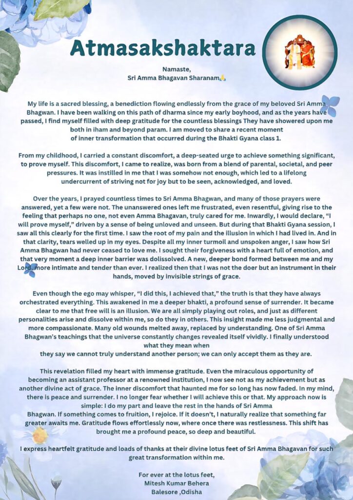 この啓示によって、私のハートは計り知れない感謝の気持ちで満たされました。有名な機関の助教授になるという奇跡的な機会でさえも、私は今では自分が成し遂げたものではなく、神の恩寵のまた別の御業の一つとして見ることができます。長い間つきまとっていた内なる不快感は、もう消えてしまいました。私のマインドには平安と委ねがあります。私はもう、これやあれを達成できるかどうかを恐れてはいません。今の私のアプローチはシンプルです。: 自分の役割を果たし、あとはシュリ アンマ バガヴァンの御手に委ねるのです。何かが実を結べば、私はとても喜びます。もしそうでなければ、もっと素晴らしいものが私を待っていることに自然に気づきます。かつては落ち着きのなさを感じていた状況でも、今では感謝の気持ちが自然に流れるのです。このシフトは 私にとても深く美しい、深遠な平安をもたらしてくれています。