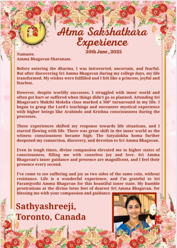 これらの体験によって、人生の出来事への私の反応が変わり、人生の流れに身を任せるようになりました。内なる世界にも大きな変化が起こり、目撃者としての意識が高まりました。サティアローカのホーマによって、シュリ・アンマバガヴァンへのつながり、気づき、そして献身がさらに深まりました。