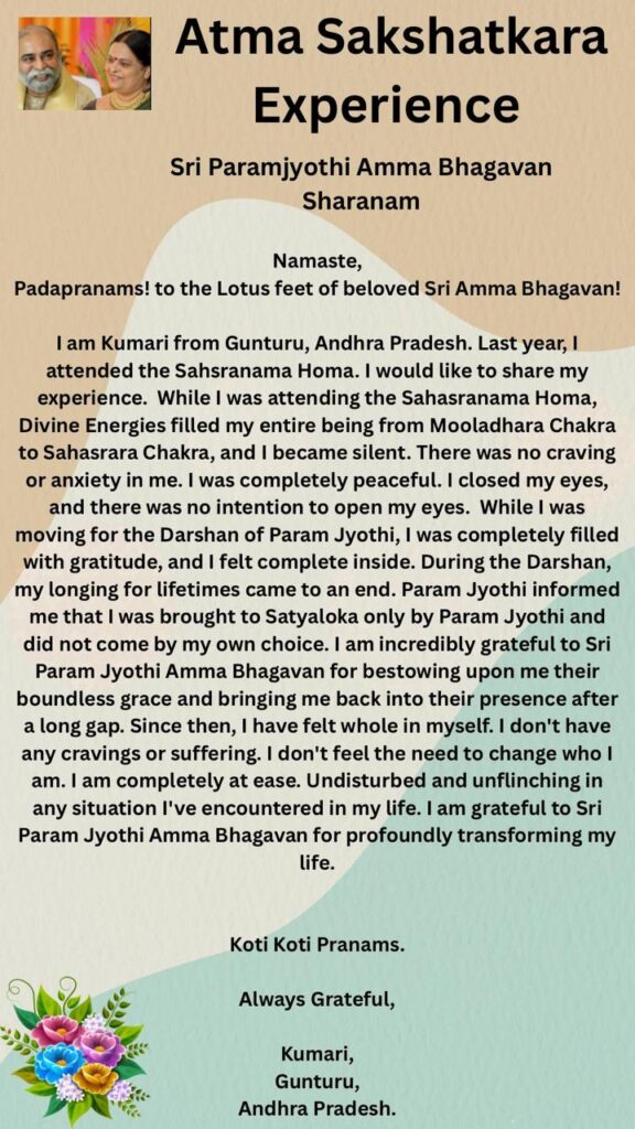 私の人生に深遠な変容をもたらしてくださいましたことに対し 私はシュリ パラム ジョッティ アンマ バガヴァンへの感謝の気持ちでいっぱいです。