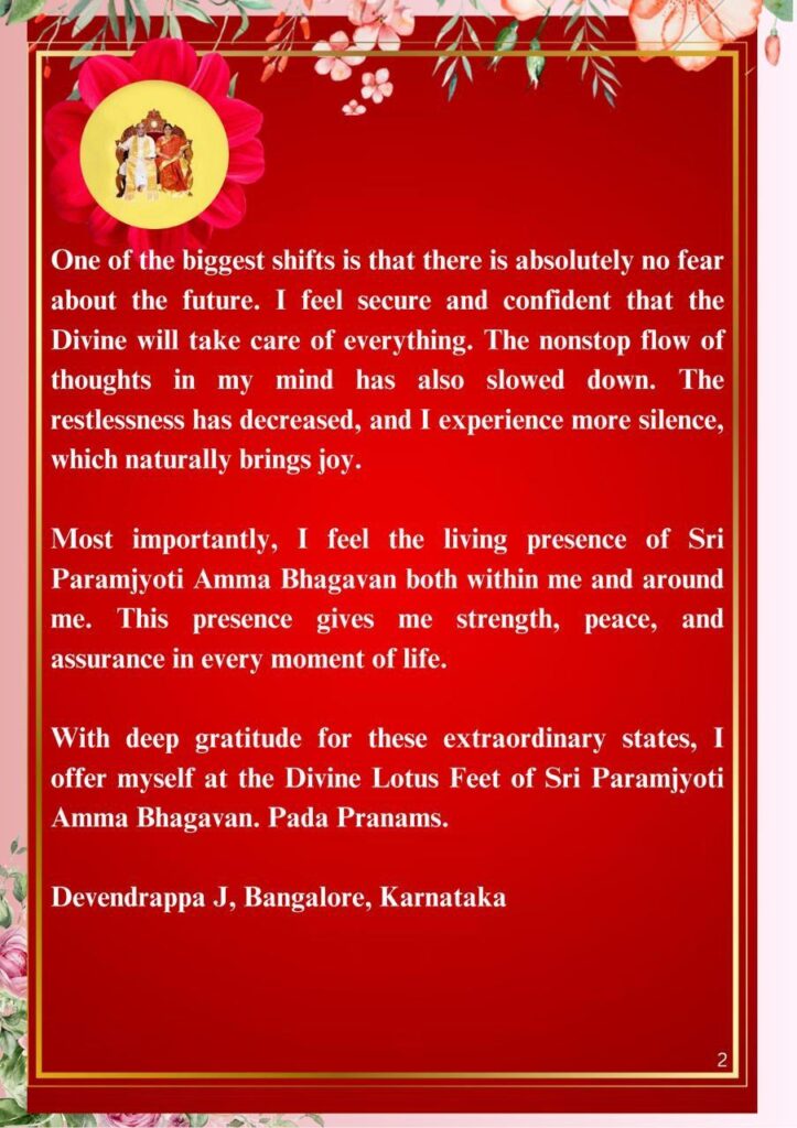 これらの素晴らしい状態に深い感謝を捧げつつ、私はシュリ・パラムジョッティ・アンマ・バガヴァンの神聖なる蓮華の御足に身を捧げます。パーダ・プラナームズ(御足に礼拝致します)。