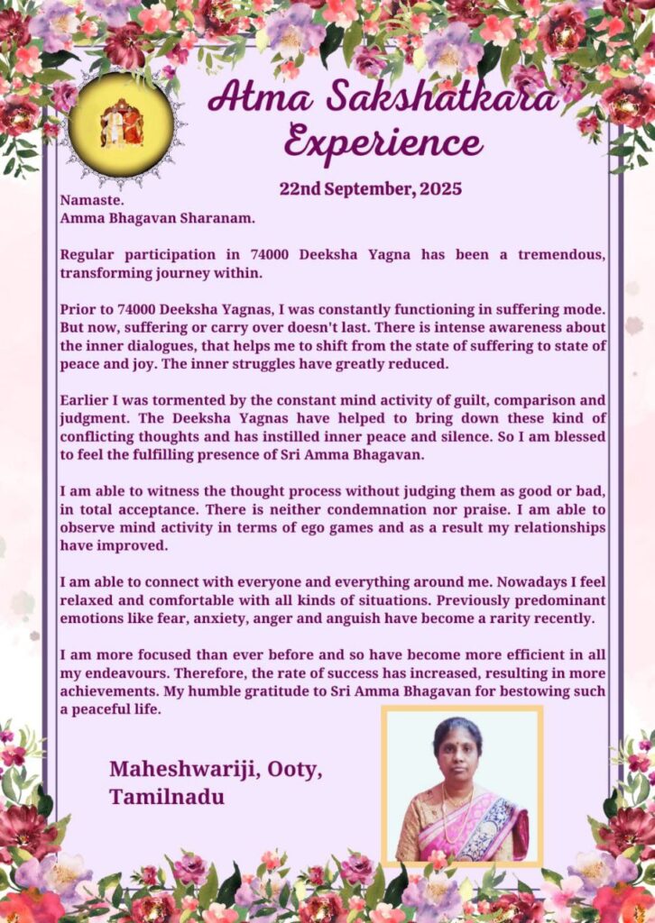 かつて、私は罪悪感や比較、そしてジャッジメントといった、継続的なマインドの活動に苦しんできました。ディクシャヤグニャはこういった思考の衝突を鎮め、内側の平安と静寂を注ぎ込んでくれたのです。そうして私はシュリ・アンマバガヴァンの臨在に満たされていると感じ、祝福されています。