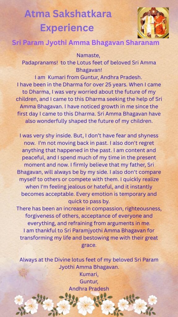 アーンドラ プラデーシュ州グントゥールのクマリです。25年以上にわたって このダルマにおります。このダルマに来たとき、私は子どもたちの将来について とても心配していました。それで、シュリ アンマ バガヴァンの助けを求めて このダルマにやってきたのでした。このダルマに入った最初の日から、自分の中の成長に気づいてきました。シュリ アンマ バガヴァンは、私の子供たちの将来も 驚くほど素晴らしく形作ってくださいました。