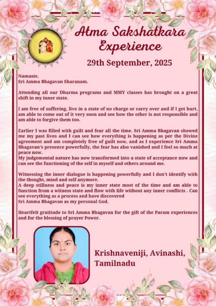 シュリ・アンマ・バガヴァンが私の過去生を見せてくださり、全てが神聖なるディヴァインとの合意に従って起こっていることが理解でき、今や罪悪感から完全に解放されました。