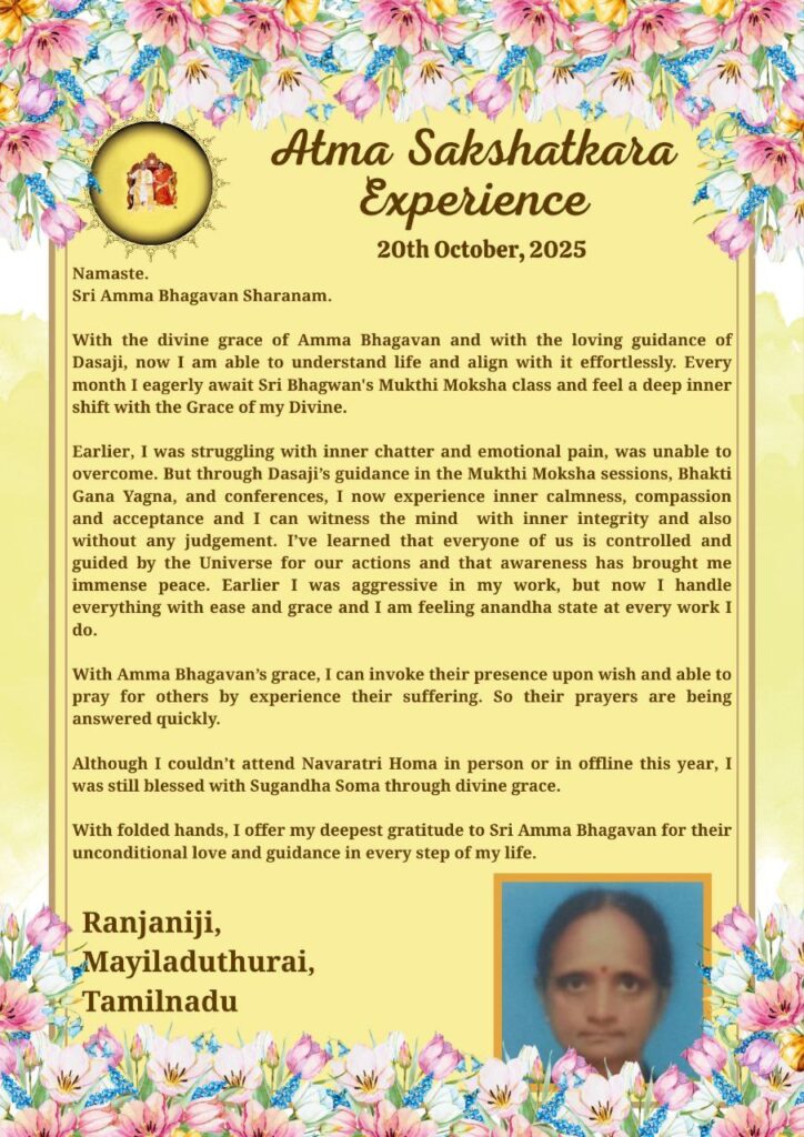 アンマ・バガヴァンの神聖なる恩寵とダーサジの慈愛に満ちた導きのおかげで、今では人生を理解し、それに楽に調和できるようになりました。