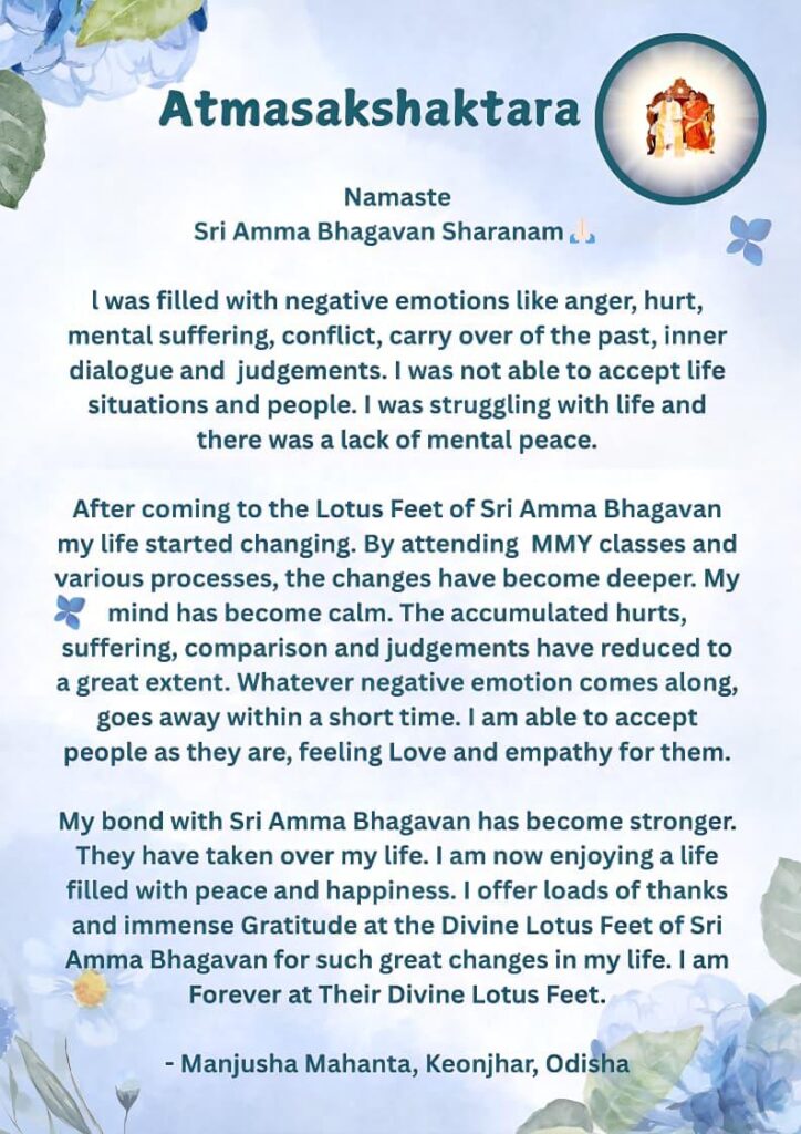 私の人生にこのような素晴らしい変化を起こして下さったシュリ・アンマバガヴァンの神聖な蓮花のおみ足元に、心からの感謝の意を表します。