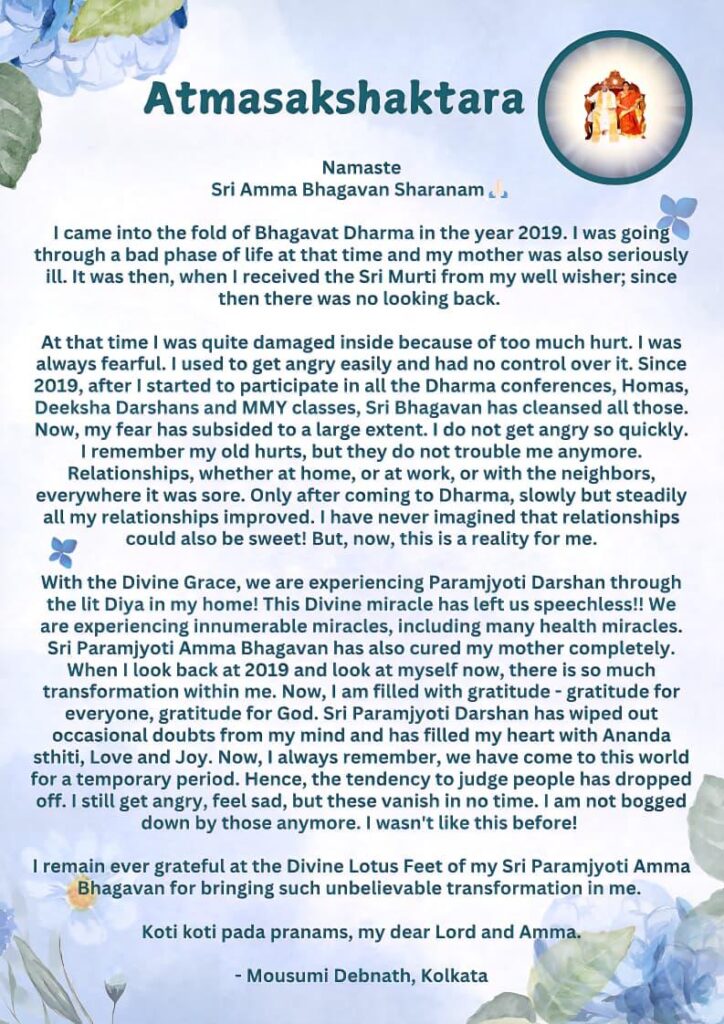 私の中に このような信じられないほどすばらしい変容をもたらしてくださいましたことを、私は永遠に シュリ パラムジョッティ アンマ バガヴァンの聖なる蓮華のおみ足のもとで 感謝いたします。