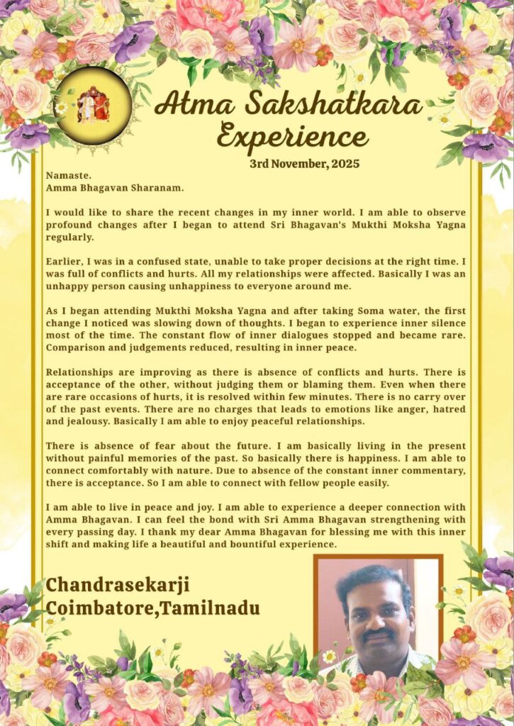 最近の私の内側の変化をシェアさせていただきたいと思います。シュリ バガヴァンのムクティ モクシャ ヤグナに定期的に参加するようになってから、私は深い変化を観察できるようになっています。
