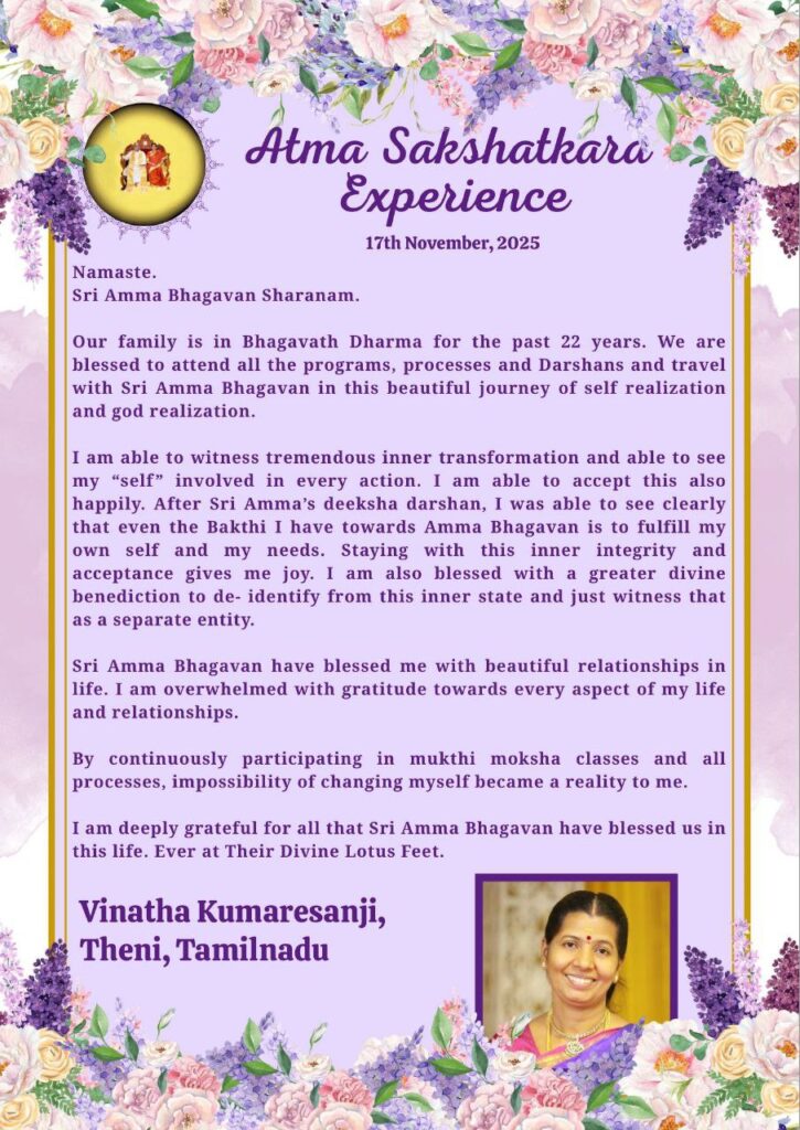 この自己実現と神実現という美しい旅路において、全てのプログラム、プロセス、ダルシャンに参加し、シュリ・アンマ・バガヴァンと共に歩ませていただける恩恵に恵まれております。