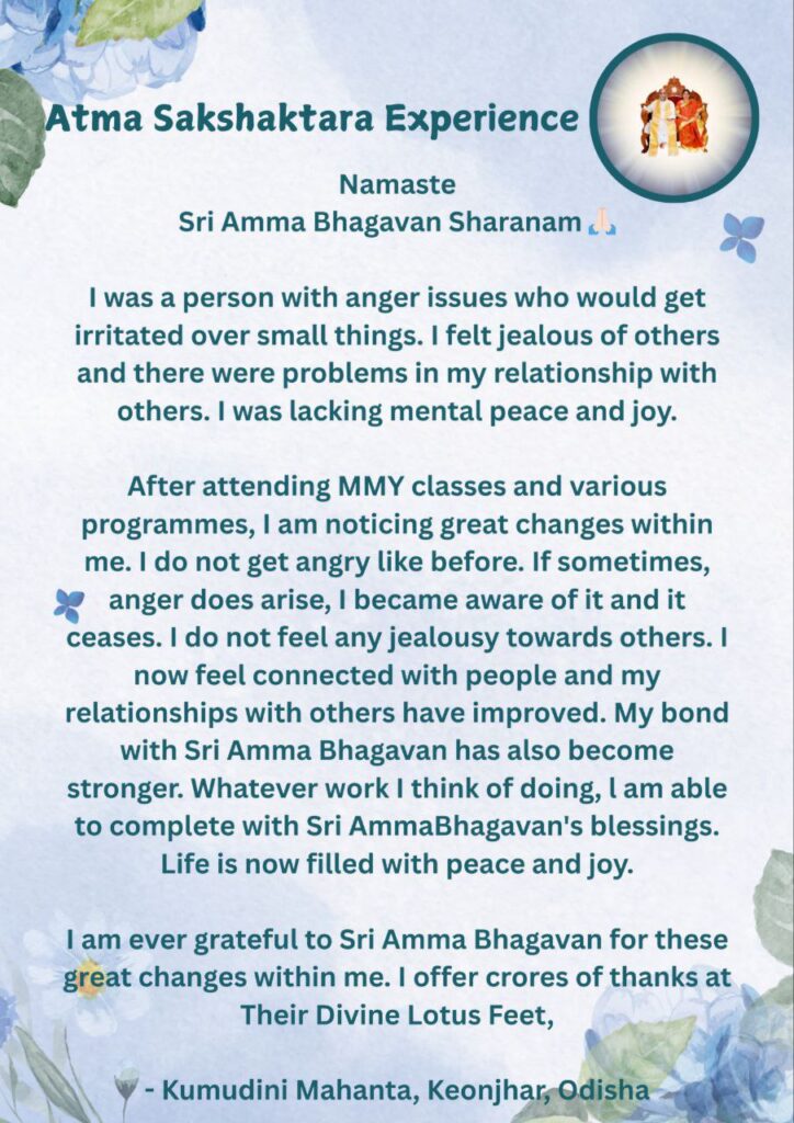 MMY(ムクティ モクシャ ヤグニャ)のクラスやさまざまなプログラムに参加してから、自分の内側に大きな変化が起こっていることに気づいています。以前のように怒りっぽくありません。たまに怒りが生じても、それに気づきます。すると、怒りは止みます。他の人たちへの嫉妬も感じません。今では人々とのつながりが感じられ、他の人たちとの関係性も改善してきています。私のシュリ アンマ バガヴァンとの絆もさらに強くなってきています。やろうと思った仕事は何でも、シュリ アンマ バガヴァンの祝福によって 成し遂げることができます。人生は今、平安と悦びで満たされています。