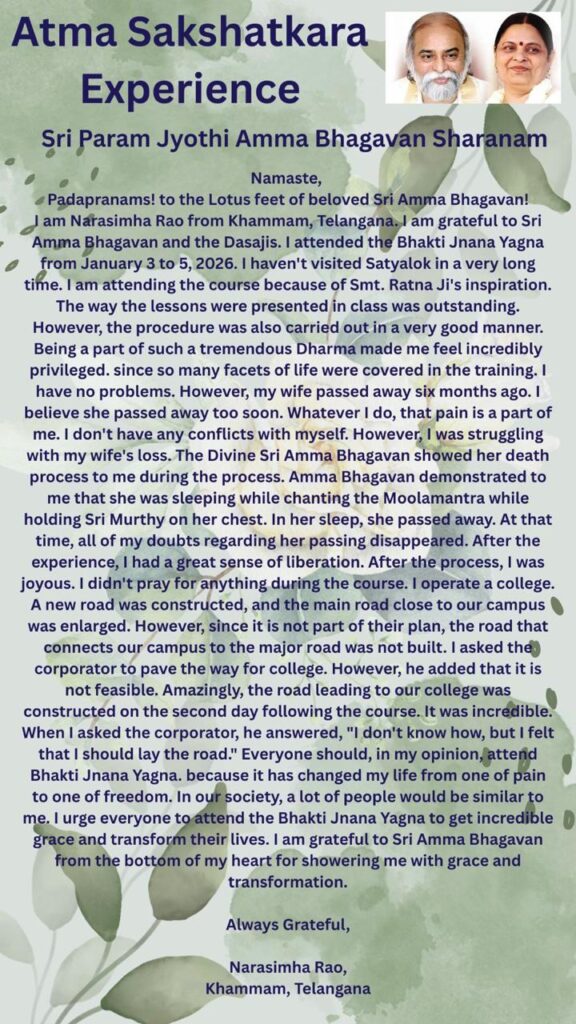 私はテランガナ州カンマムのナラシンハ ラオです。シュリ アンマ バガヴァンとダーサジの皆さんに感謝申し上げます。2026年1月3日から5日までのバクティ ニャーナ ヤグナに参加いたしました。サティヤローカには ずいぶん長いこと行っていませんでした。ラトナ夫人が与えてくれたインスピレーションによって このコースに参加しています。