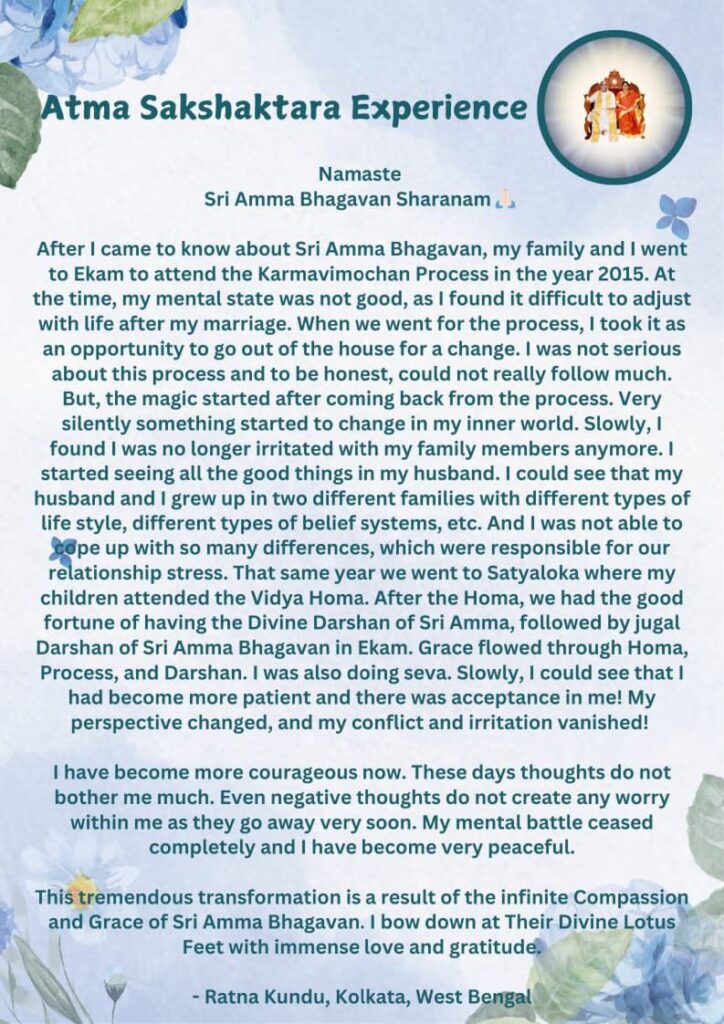 シュリ アンマ バガヴァンについて知るようになってから、私は2015年に家族とエカムに行き、カルマヴィモチャナ(カルマの解放・解消)のプロセスに参加しました。当時、結婚後の生活に適応するのが難しいとわかり、私の精神状態は良くありませんでした。私たちがプロセスに参加しに行ったとき、私はそれを 気分転換に外出する機会として捉えていました。私はこのプロセスに対して真剣に取り組んでいなかったので、正直なところ、あまりついていけていませんでした。