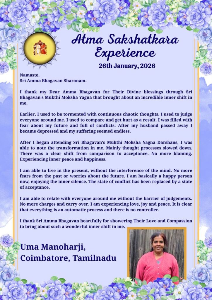 シュリ・バガヴァンのムクティ・モクシャ・ヤグニャを通じて、私の中に信じられないほどの内面の変化をもたらしてくださった、愛するアンマ・バガヴァンに、その神聖な祝福に感謝いたします。