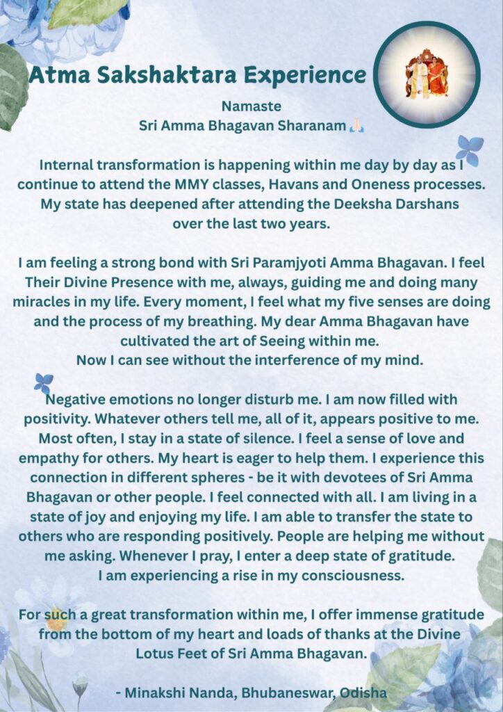 私はシュリ パラムジョッティ アンマ バガヴァンとの強い絆を感じています。彼らのディヴァイン(聖なる存在)が常に私と共にあり、私を導き、私の人生において 多くの奇跡を起こしてくださっていると感じます。一瞬一瞬、自分の五感が何をしているかや 自分の呼吸のプロセスを感じています。私の親愛なるアンマ バガヴァンは、私の中に「観る」という技術を育んでくださいました。今、私は自分のマインドの干渉なしに観ることができます。