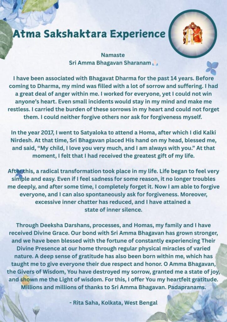 2017年私はホーマに参加するためにサティアローカへ行き、その後カルキ・ニルデシュを行いました。