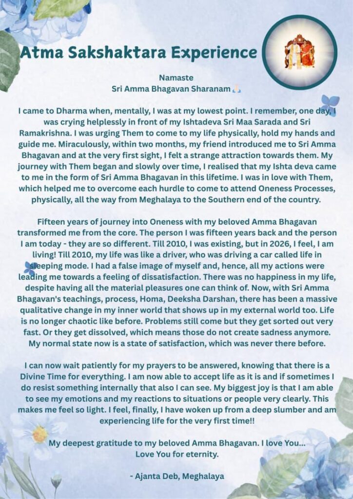 最愛のアンマ・バガヴァンとの15年にわたるワンネスへの旅は、私の核心から変容をもたらしてくださいました。