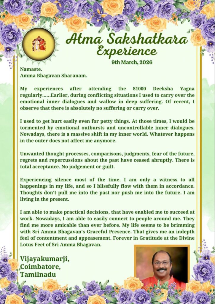 私の人生は、シュリ・アンマバガヴァンの思いやりに満ちた存在で溢れているように感じられます。それは私に、深い満足と安らぎをもたらしています。