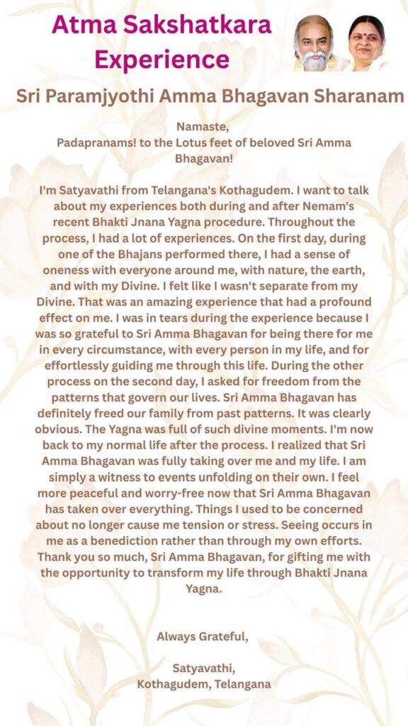 私はテランガーナ州コタグデムのサティヤヴァティです。バクティ ニャーナ ヤグニャ(バクティ:愛と献身、ニャーナ:真理の学び、ヤグニャ:聖なる(火の)儀式・行為)の前と後の両方の体験について お話しさせていただきたいと思います。