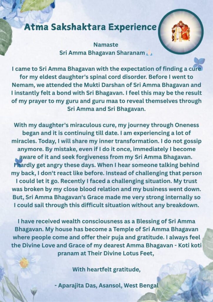 長女の脊髄疾患の治療法を見つけられるという期待を胸に、シュリ・アンマ・バガヴァンのもとを訪れました。