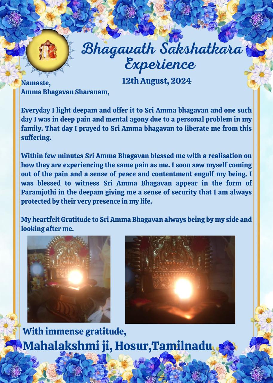 数分以内に、シュリ・アンマバガヴァンは、彼らが私と同じ苦しみ体験しているという認識を私に与えてくださいました。私はすぐに自分自身が痛みから抜け出し、平安と満足感が私の存在を包み込んでくれていることに気づきました。私はシュリ・アンマバガヴァンがパラムジョッティのお姿でディーパムの中に現れるのを目撃し、私の人生において、彼らの臨在そのものがいつも私を守っているという安心感を与えられ、祝福されたのです。