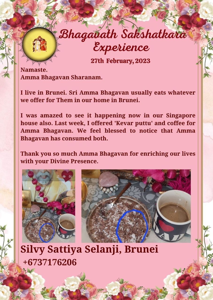 私は今、シンガポールでの自宅でも同じことが起こり、喜んでいます。先週、私はケーヴァルプットゥ(米の中にフィリングを入れ、削ったココナツを重ねて蒸した料理)とコーヒーをアンマバガヴァンにお供えしました。アンマバガヴァンがそのどちらも召し上がったのに気づき、私たちは祝福された気持ちになりました。