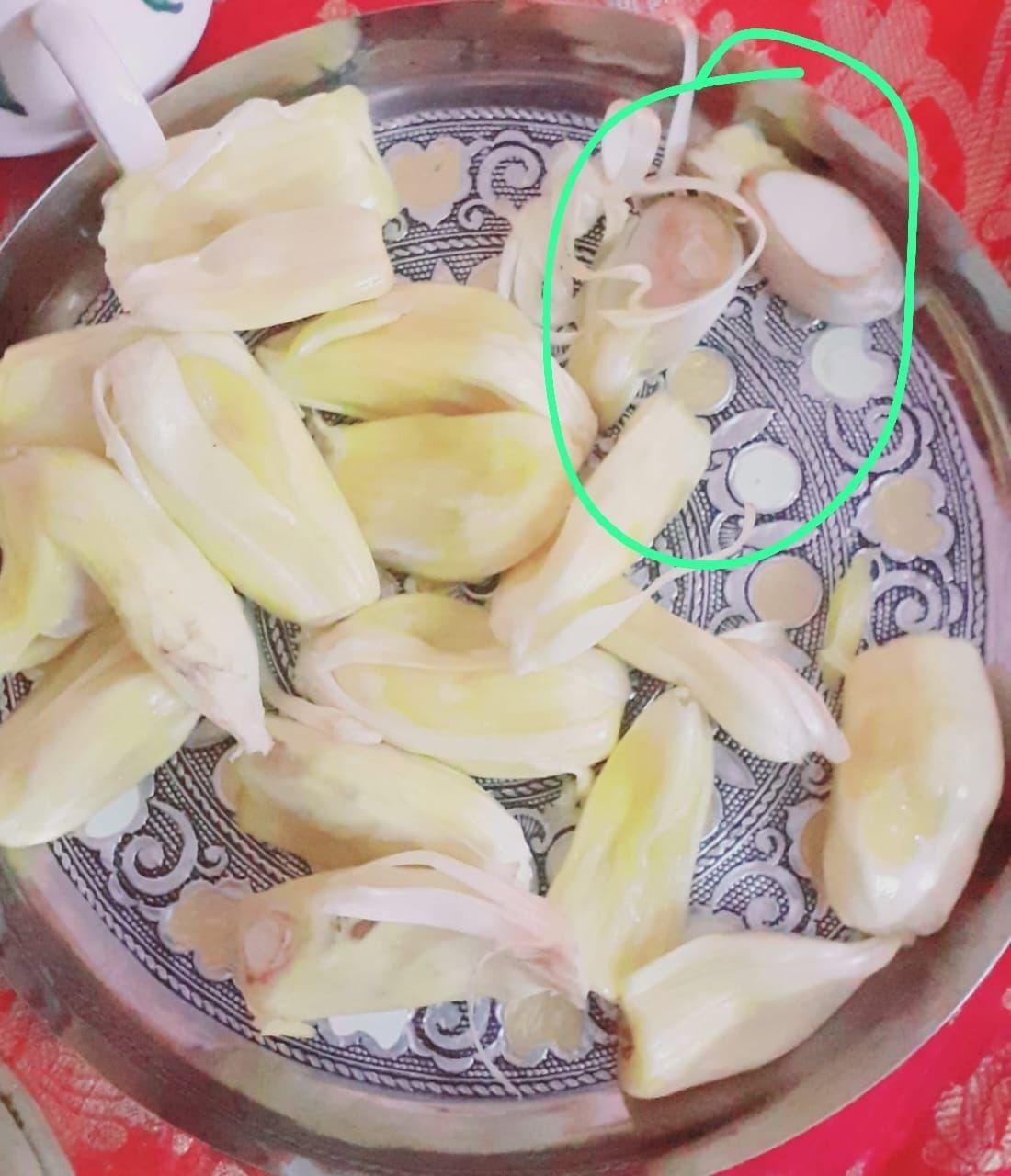しかし、しばらくして手を洗って戻ると、あまりの衝撃におどろきました。ジャックフルーツが食べられ、側に種が置いてあったのです。